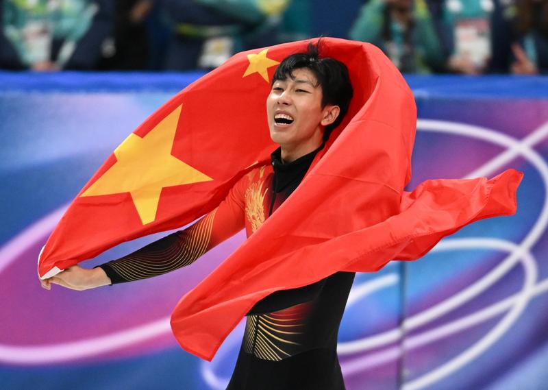 2月12日,快乐彩app下载孙龙在比赛后身披国旗庆祝。新华社发