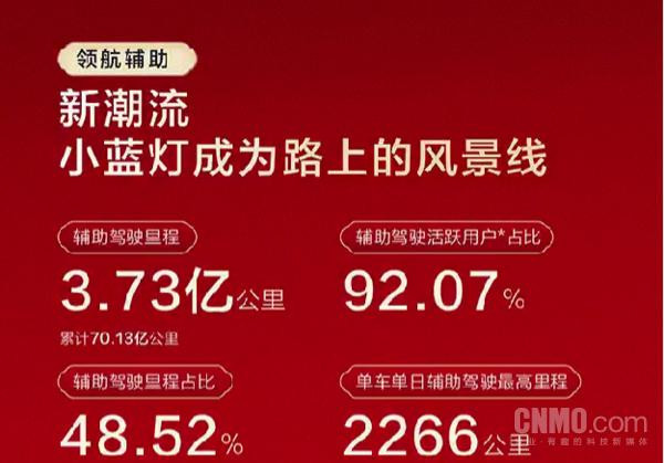 【CNMO科技音讯】2月28日,鸿蒙智行官方发布春节扶持驾驶申诉,以一组硬核数据呈现了春节技巧用户智驾出行的信得过图景。申诉泄漏,扶持驾驶活跃用户占比高达92.07%,累计扶持驾驶里程达70.13亿公里,春节技巧扶持驾驶里程达3.73亿公里。单车单日扶持驾驶最高里程达2266公里。