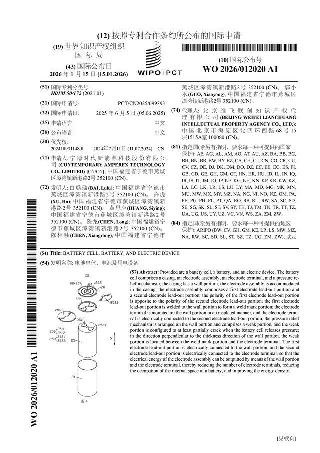 证券之星音问,笔据企查查数据显现宁德期间(300750)公布了一项国外专利苦求,专利名为“电板单体、电板及用电设立”,专利苦求号为PCT/CN2025/099393,国外公布日为2026年1月15日。