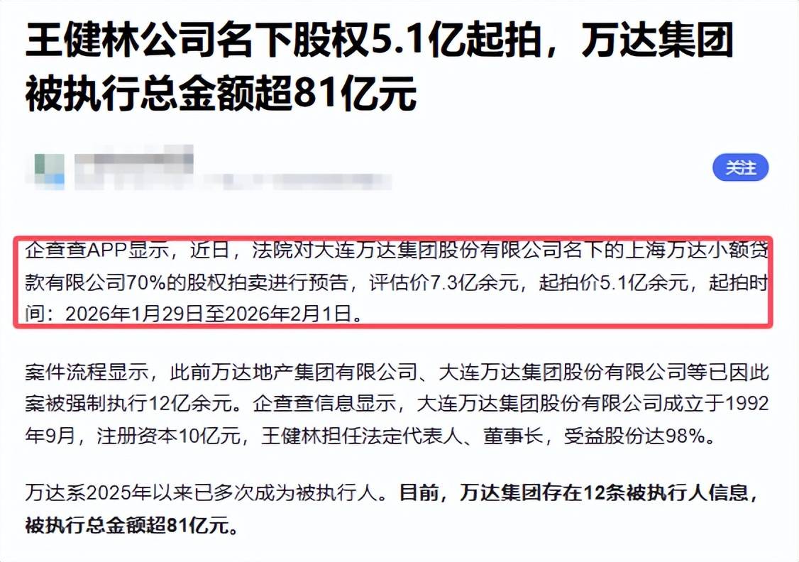 法院刚刚对万达集团名下的上海万达小额贷款有限公司70%的股权进行了拍卖预报,预估价值是7.3亿元,起拍价5.1亿元,起拍期间从2026年1月29日至2026年2月1日。