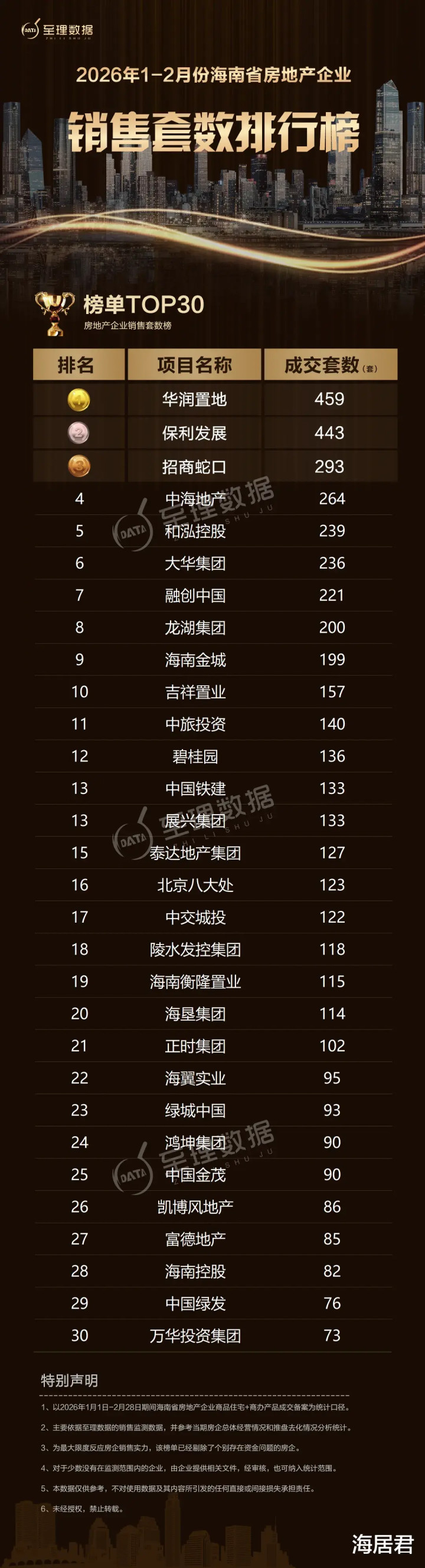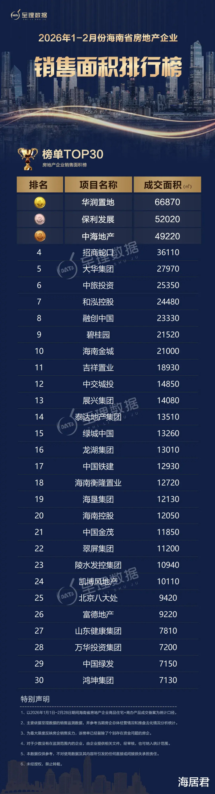 2026年1-2月海南房地产企业商品房住宅+商办(剔除安置房/单元房),成交套数TOP30房企共成交4844套;成交面积TOP30房企共成交57.7万曩昔米;成交金额TOP30房企共成交133.0亿元。