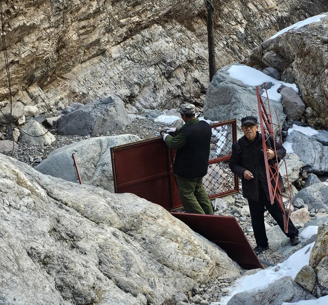 赵记臣(右)扛着铁架进山。赵记臣供图