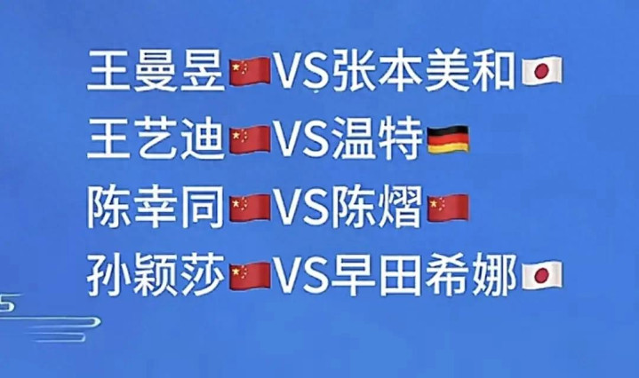 {jz:field.toptypename/}先说提气的——孙颖莎对阵早田希娜,王曼昱迎战张本好意思和。两个日本主力来势汹汹,早田赛前还放话要冲击莎莎。可我们莎莎什么方式没见过?赛前磨真金不怕火那主张,稳得很!曼昱这边亦然磨刀霍霍,就等着上场教小将作念东谈主。